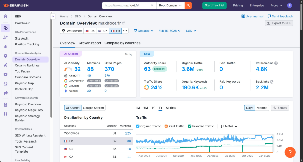 Overall, Maxifoot.fr holds a strong SEO position in French football media, supported by solid domain authority and highly relevant sports content. Its dominance in core local football keywords creates high barriers for direct competitors.