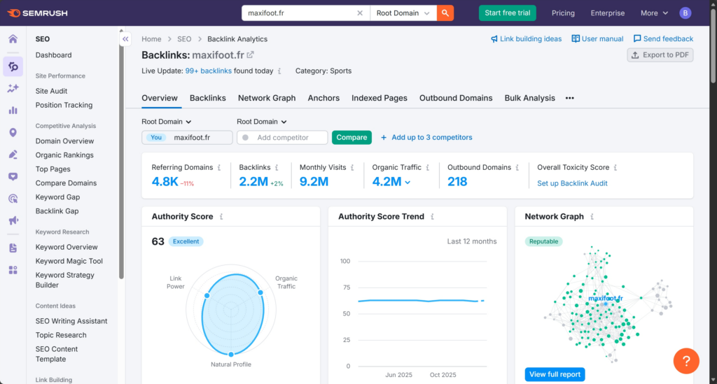 - Link Quality & Toxicity: * The Network Graph indicates a “Reputable” profile with a dense cluster of high-quality connections.