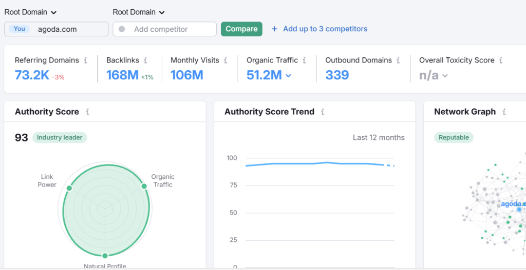 Its Authority Score of 93, labeled “Industry leader,” and 51.2M organic backlinks highlight exceptional domain credibility. With 339 outbound domains, Agoda demonstrates a strategic approach to external linking.